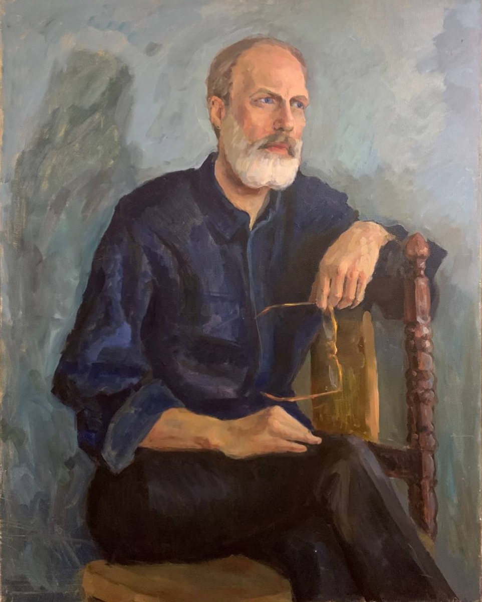 мужской академический портрет с руками, выполнен в технике масляной станковой живописи.
