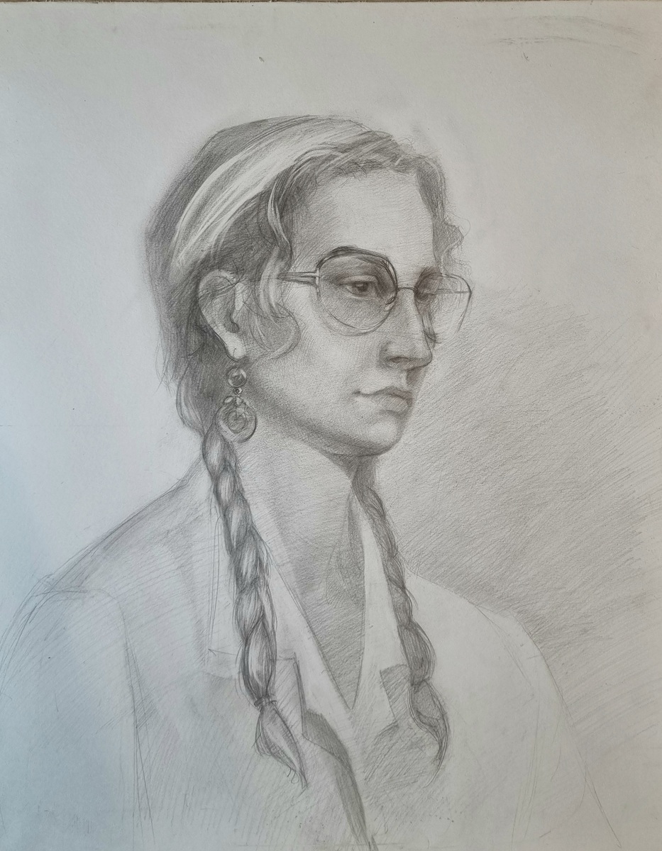 Портрет девушки в очках, бумага, графитовй карандаш. Учебная работа.