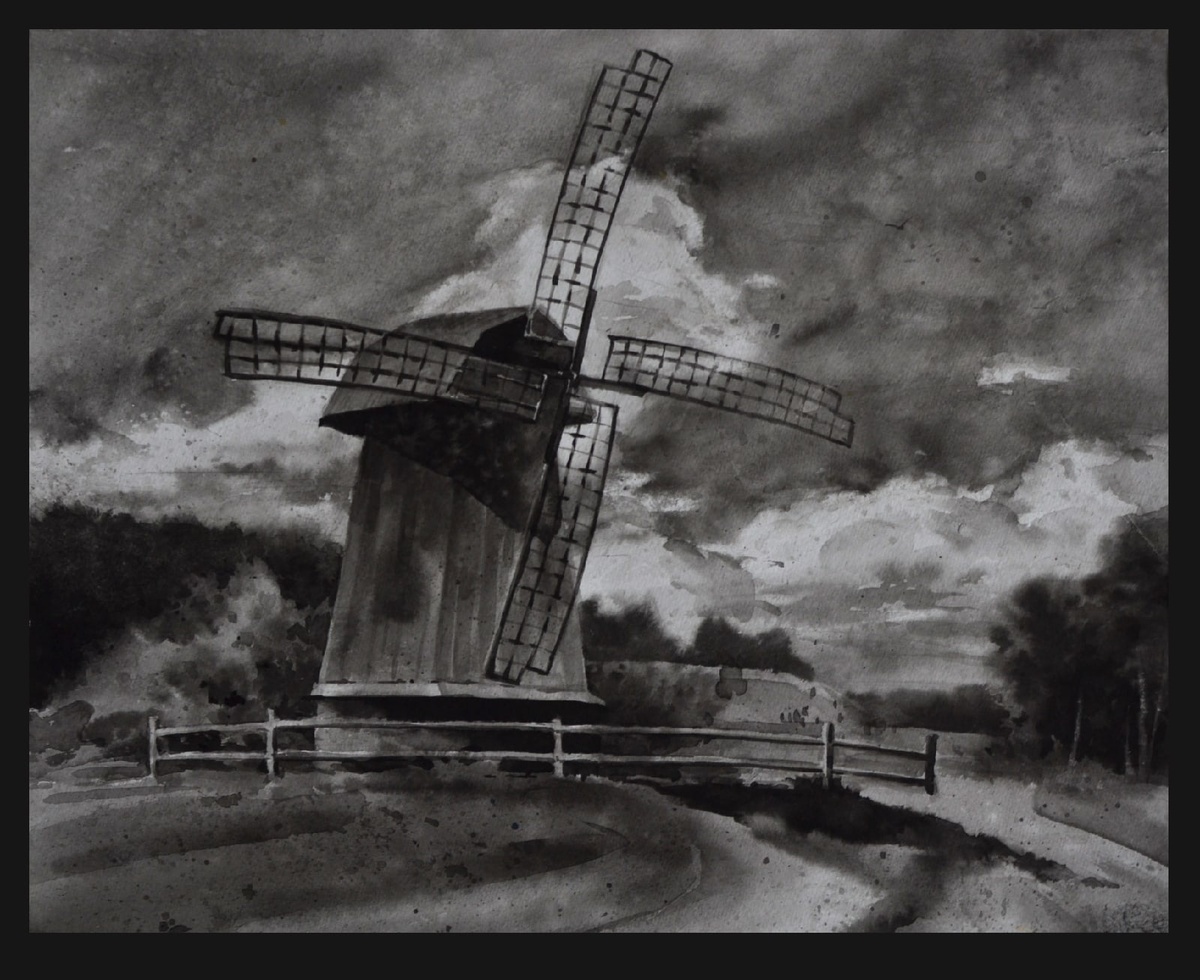 Работа выполнена тушью на плотной акварельной бумаге. Живописное изображение мельницы на фоне неба.