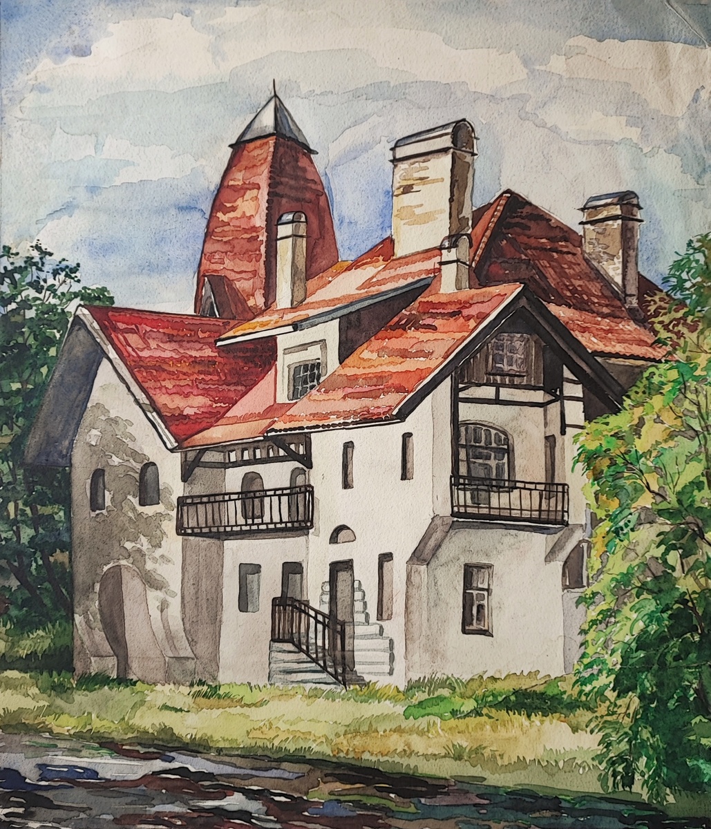 Без оформления. Вышлю в тубусе. Особняк Э. Г. Фолленвейдера - памятник архитектуры на Каменном острове в Санкт-Петербурге. С натуры на пленэре. Летняя практика по живописи. Картина акварель с видом Петербурга. Живопись красивый дом в стиле северного модерна. Неоромантическое направление.