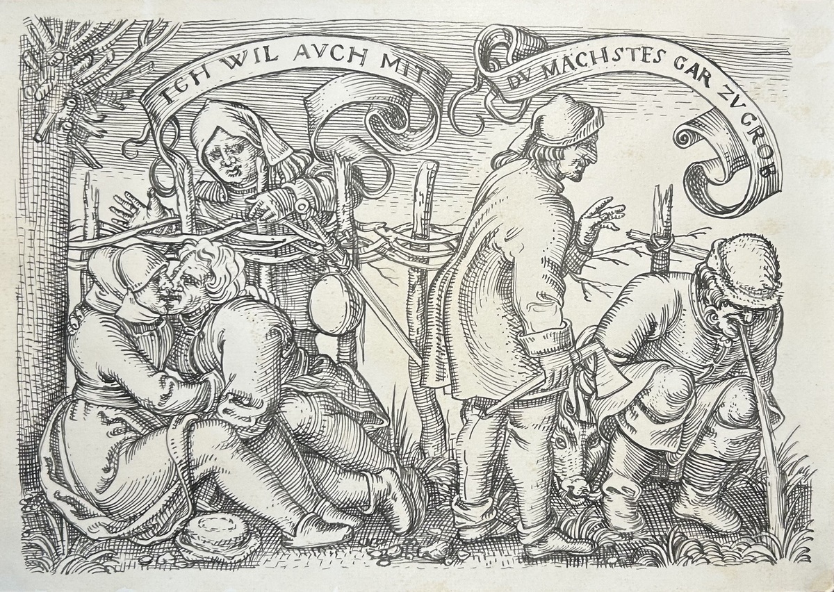 Копия гравюры Ганса Себальд Бехама Крестьянский пир Состаренная бумага, тушь