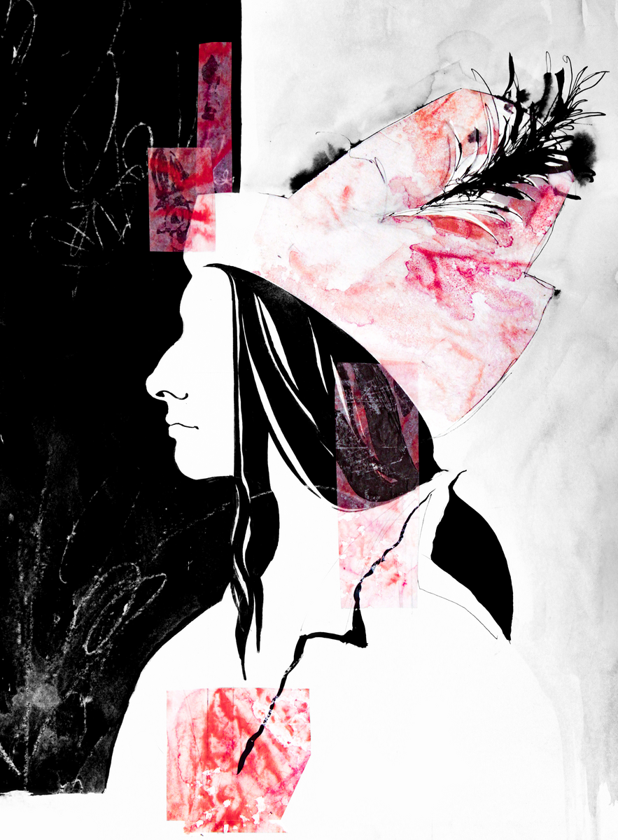 Создавала образ на контрасте. Красная аппликация — как взрыв на графичном фоне. Цель — визуальный удар, мгновенное воздействие. Развиваю тему плаката, где главное не повествование, а знак. Соединила гладкую, мягкую текстуру лица, которая поминает след на древнем рельефе с живыми, резкими линиями фона. Самый эмоциональный акцент — процарапанное, размытое перо на головном уборе