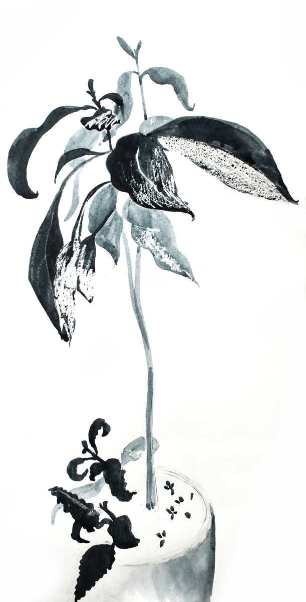Изображение комнатного растения. Работала контрастом мягких акварельных размывок и чётких чернильных линий. Асимметричная композиция ловит пластику стеблей, как танец. Контраст пятен и прозрачных участков создаёт глубину, сдержанный горшок — ставит точку. Лаконичная чёрно-белая гамма и фактурность создают повод для созерцания