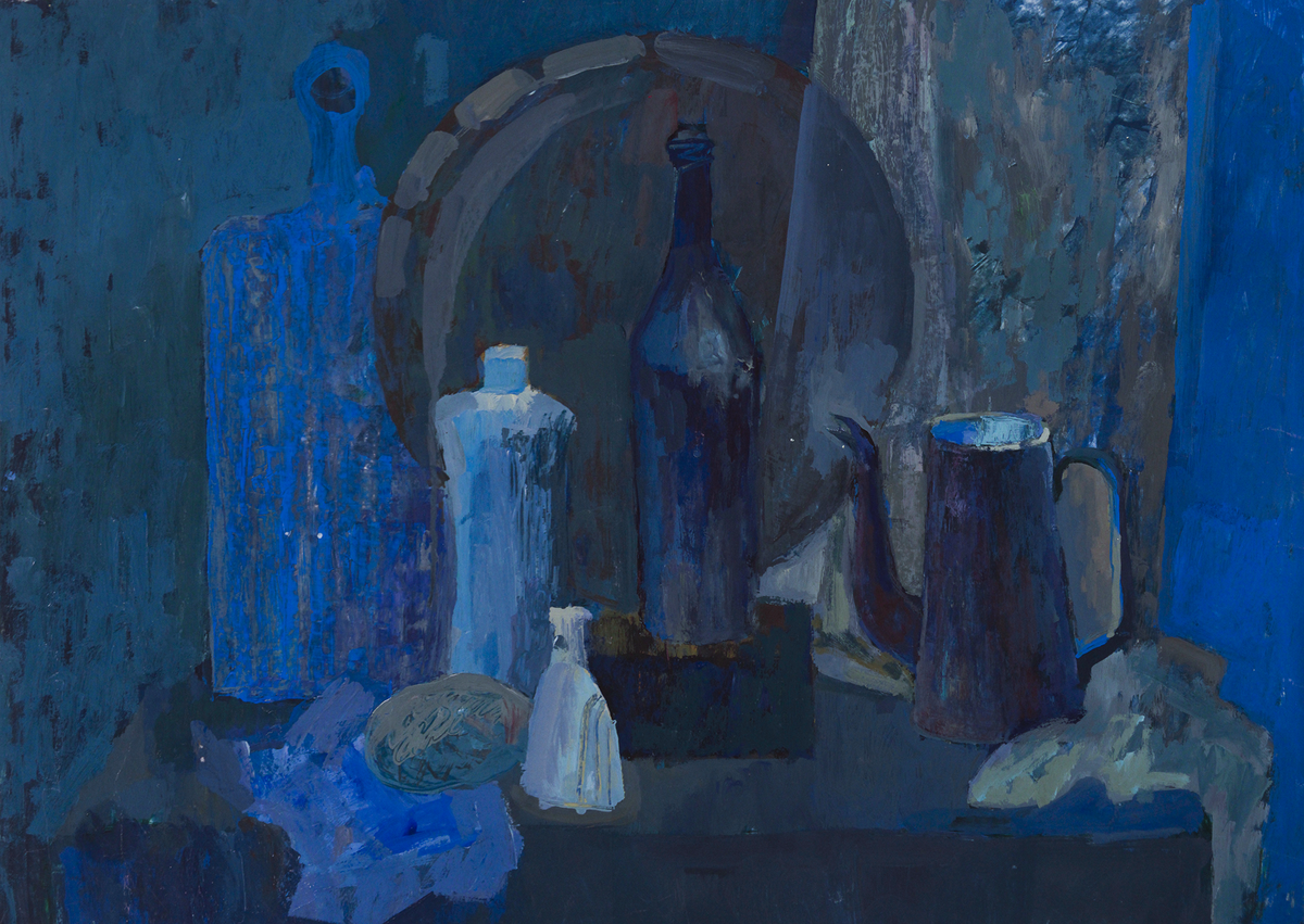 Фактурная композиция в холодной гамме. Синие предметы на серой драпировке написаны пастозно и жидко, создавая мерцающую поверхность. Напоминает зимний пейзаж с налётом ледяного блеска