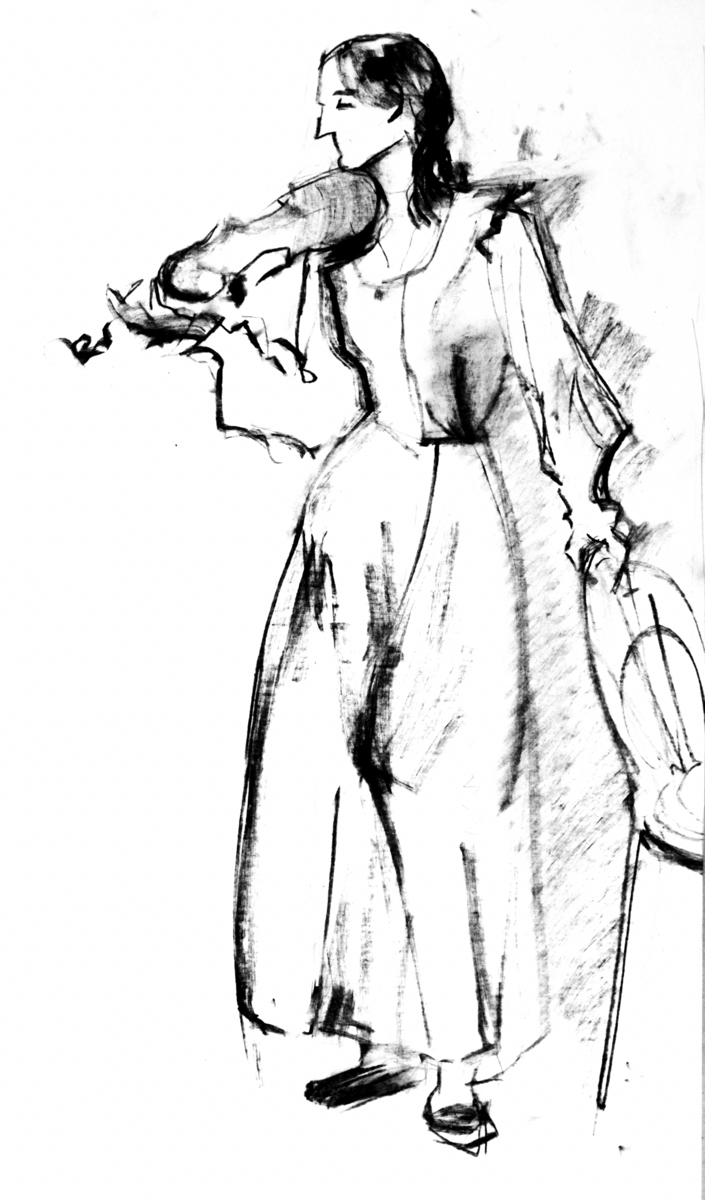 Поэтичный образ музыканта. Лёгкие, воздушные линии угля рисуют фигуру со скрипкой в момент тишины между звуками