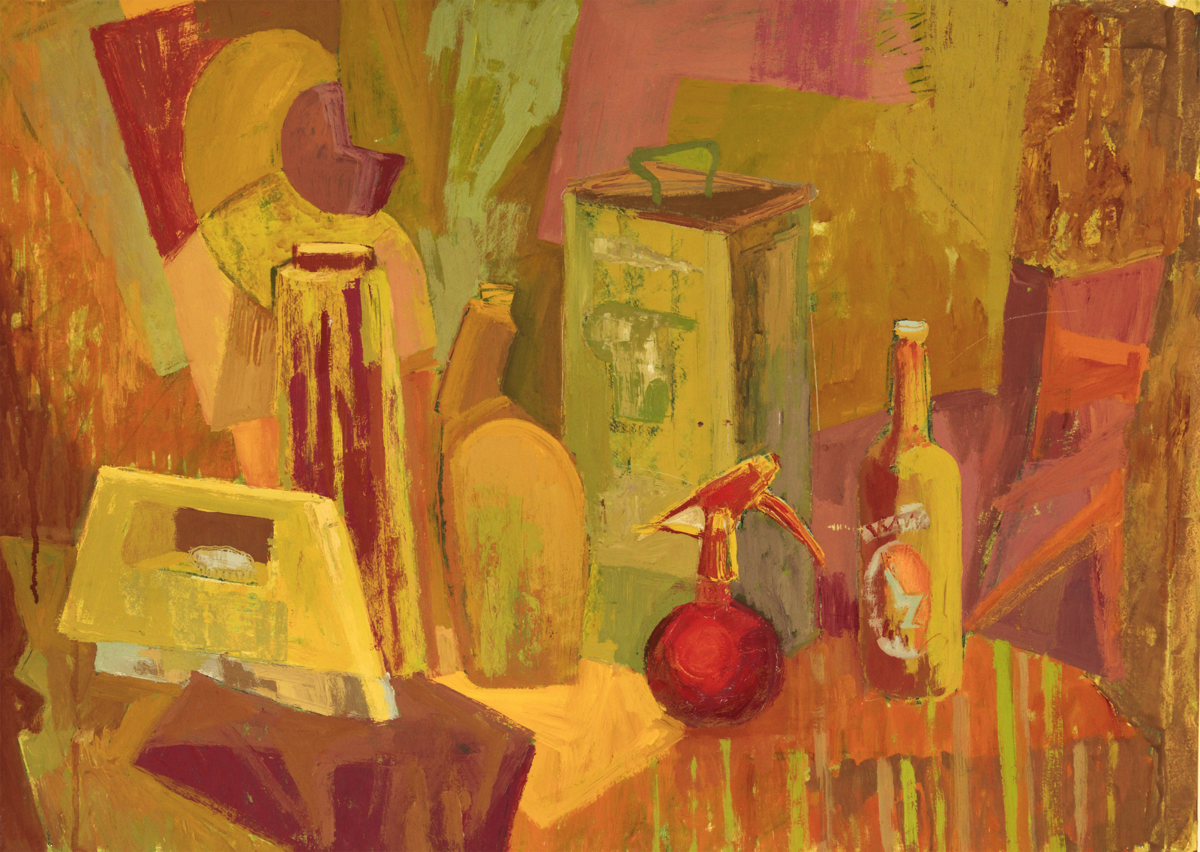 Натюрморт с утюгом, жестяными коробками и пульверизатором. Плотная жёлто-красная гамма создаёт ощущение тепла и скрытой жизни обыденных вещей