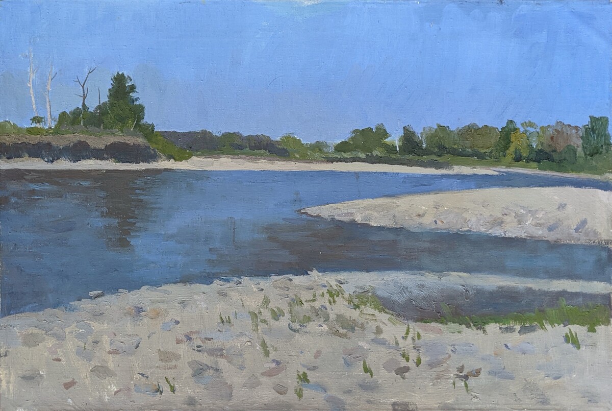 Этюд с изображением спокойной реки, выполнен с натуры масляными красками на холсте