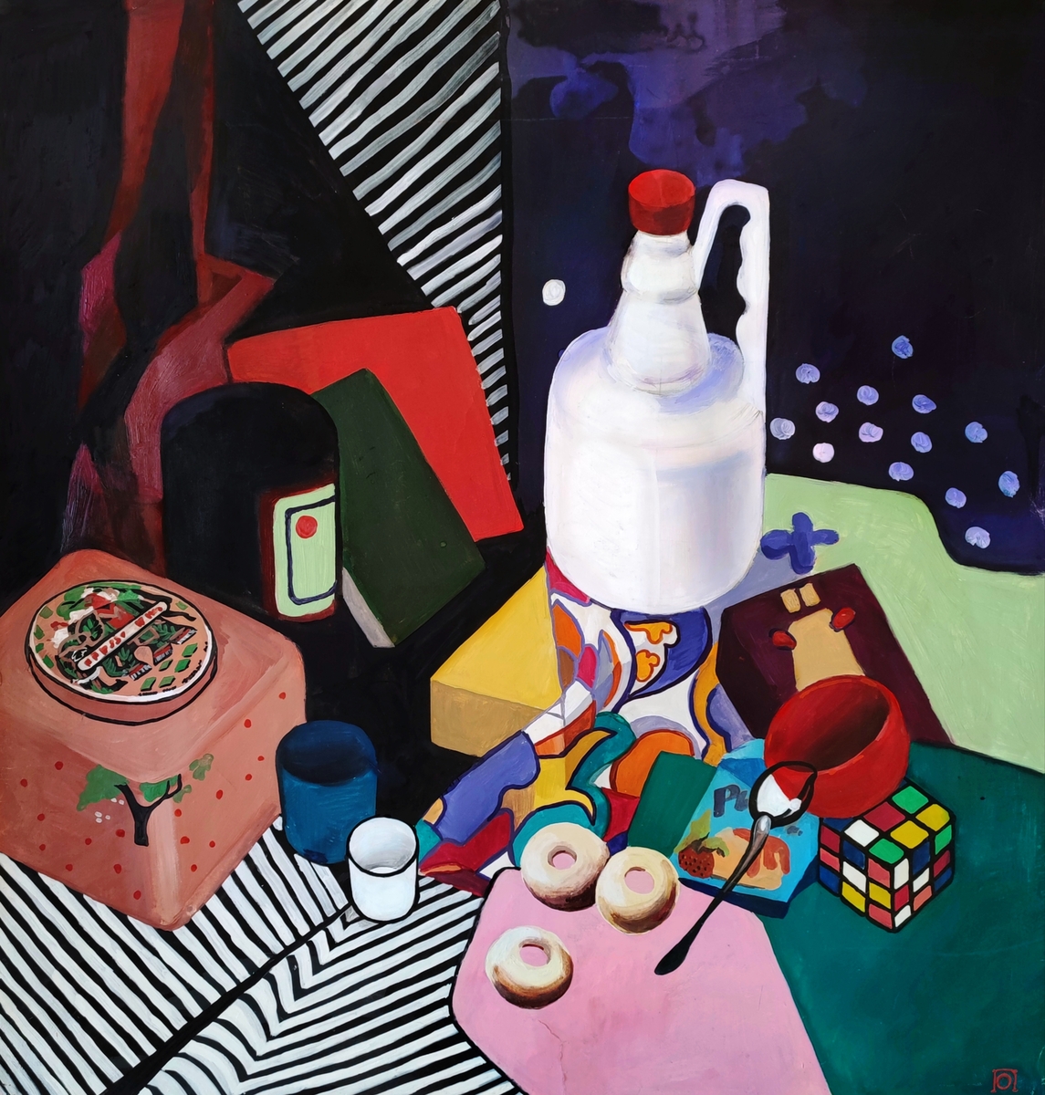 Без оформления. Вышлю в тубусе. Натюрморт из домашних предметов в 90-е: бутылка концентрированного сока (кажется Mehukatti, возможно Zuko, Invait, Yupi), кубик Рубика, жестяная коробка с индийским чаем, иностранный пакетик для приготовления какого то мусса или желе - его жалко было использовать, так и лежал годами, книги, крышка-чашка от термоса, китайская стопка - ими не пользовались, просто хранили.
