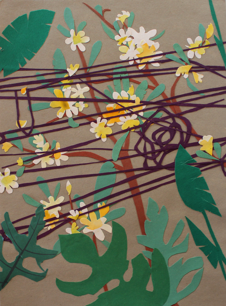 Коллаж «Плюмерия в проводах» из серии работ об Индии и Таиланде создан во время путешествия, из доступных материалов найденных в ближайшем супермаркете: детской цветной бумаги и клея ПВА. Художница сознательно использует то, что легко поместится в рюкзак и доступно даже в самых отдалённых местах. В работе изображено тропическое растение Плюмерия, которая пробивается и растёт сквозь хаотично натянутые провода -- регулярное явление в Юго-Восточной Азии.