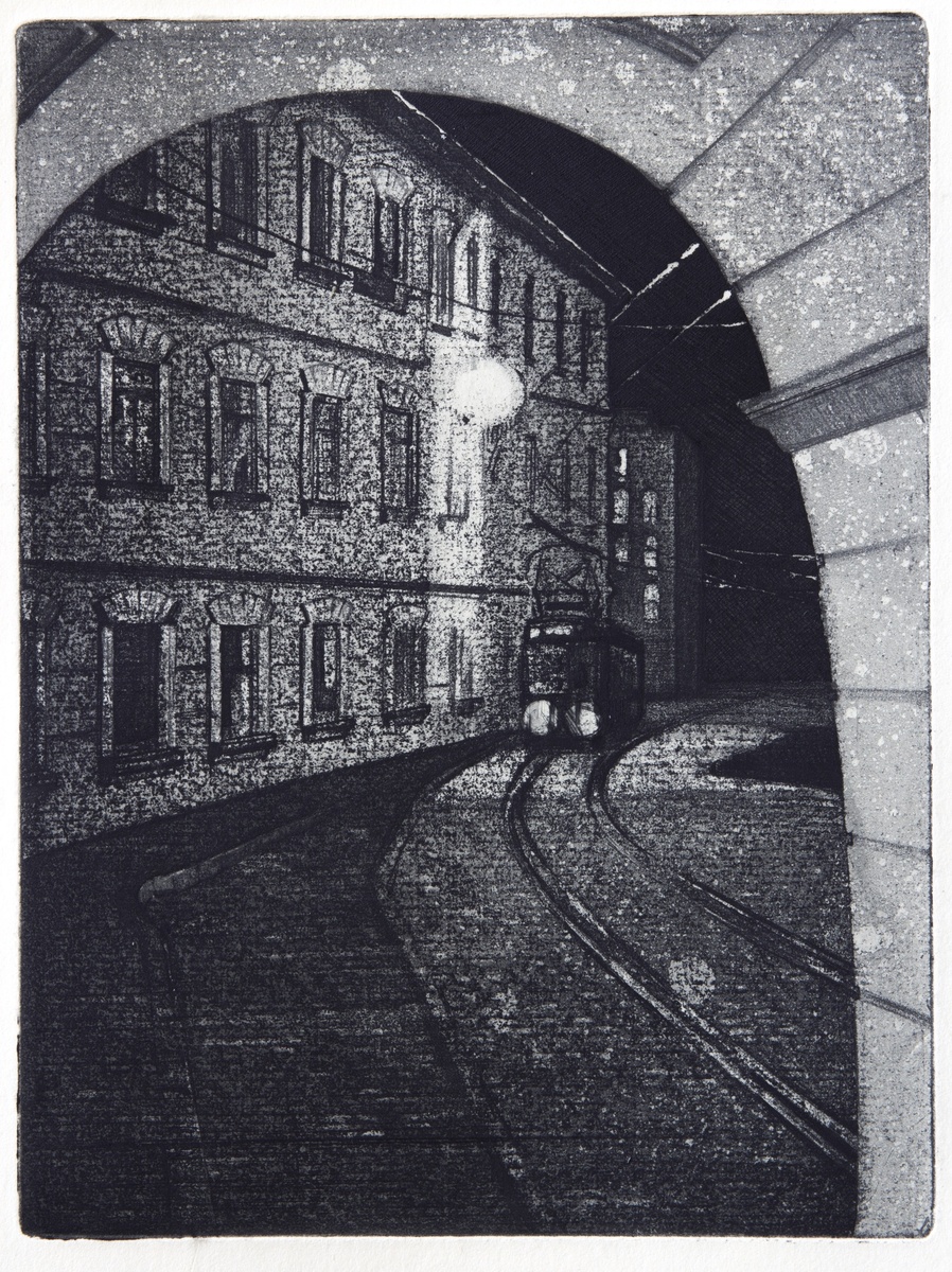 "Вечерний час". Офорт. 17:21, 2021. По мотивам стихотворения В. Брюсова "Огни! Лучи! Сверканья! Светы!"