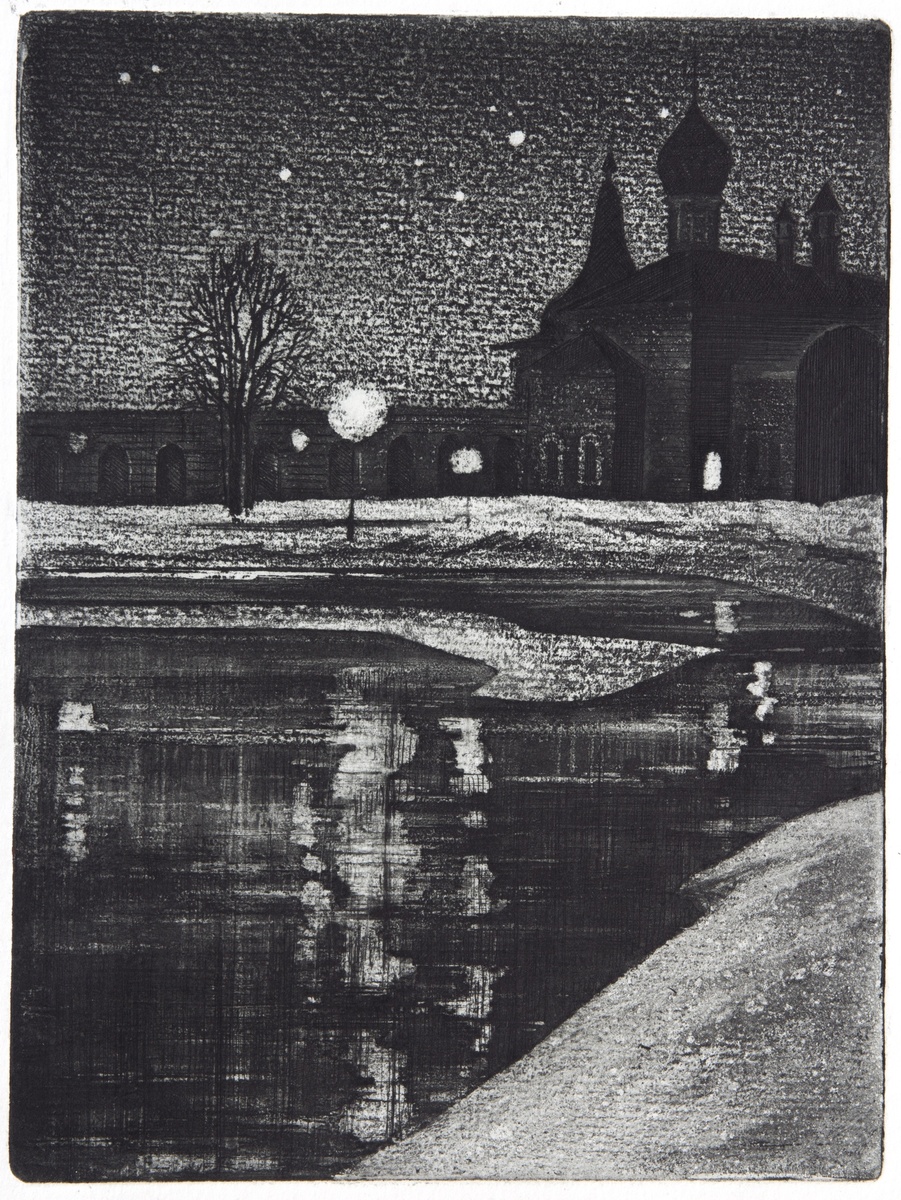 "Вечером перед церковью". Офорт. 17:21, 2021. По мотивам стихотворения В. Брюсова "Вечером перед церковью"