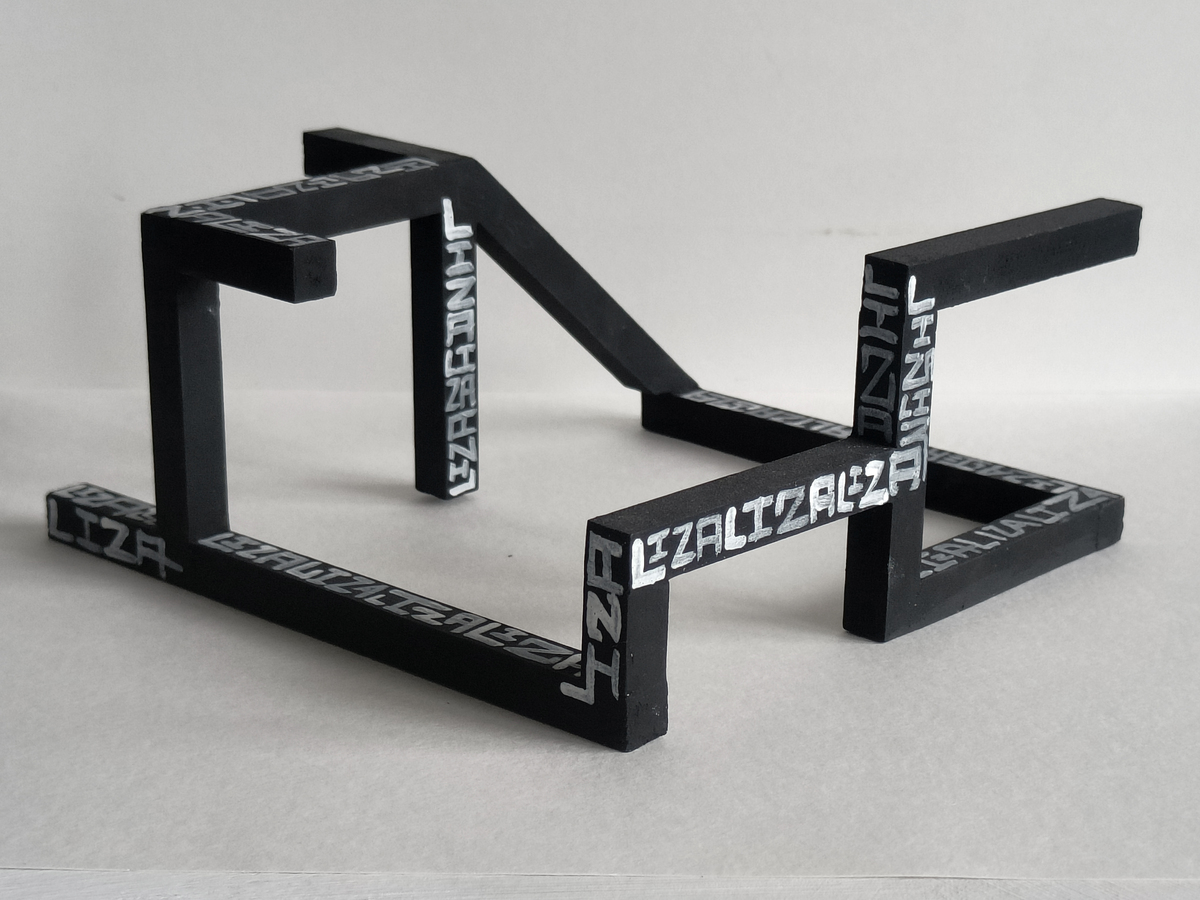 Буква — плоский графический символ, изображенный на листе бумаги. Но как буква поведёт себя в пространстве? Абстрактная круглая скульптура "LIZA", имеет 2 угла обзора с которых можно прочитать имя. Я исследую буквы и то, как они располагаются в пространстве, создавая визуальную игру с разными точками зрения. Новые углы обзора рождают новые формы и буквы.