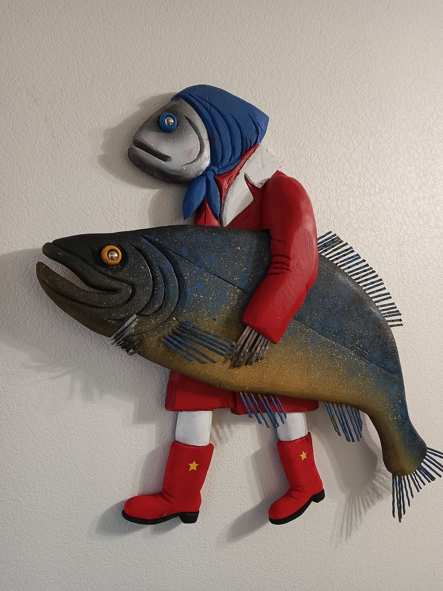Рыба похищает рыбу. Никакой политики. Материал: дерево, металл, пластик. Размер: 60см х 70см х5см