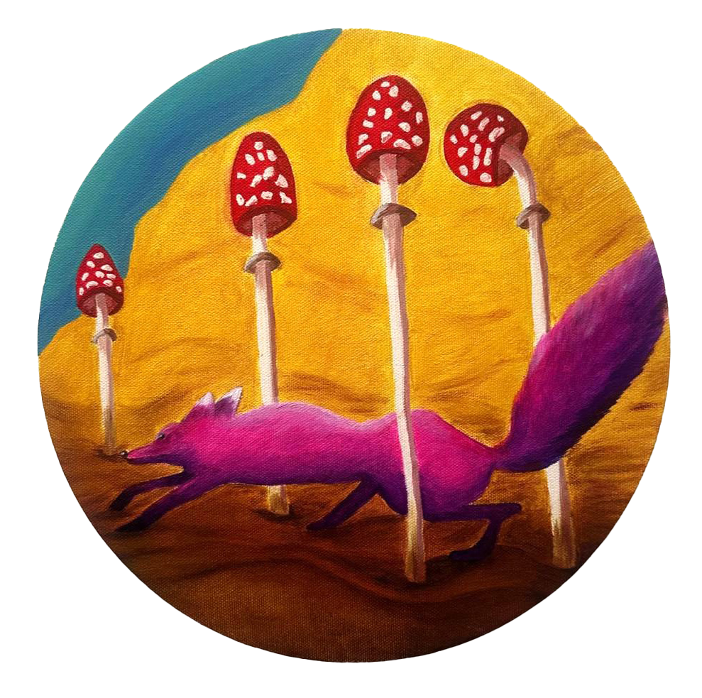 Сказочная картина с необычными обитателями: розовой пушистой лисой и красочными высокими мухоморами погружает в сказку и создает ощущение чего-то нового и необычного. Картина была представлена на выставкt «И вот я здесь», Omelchenko gallery.