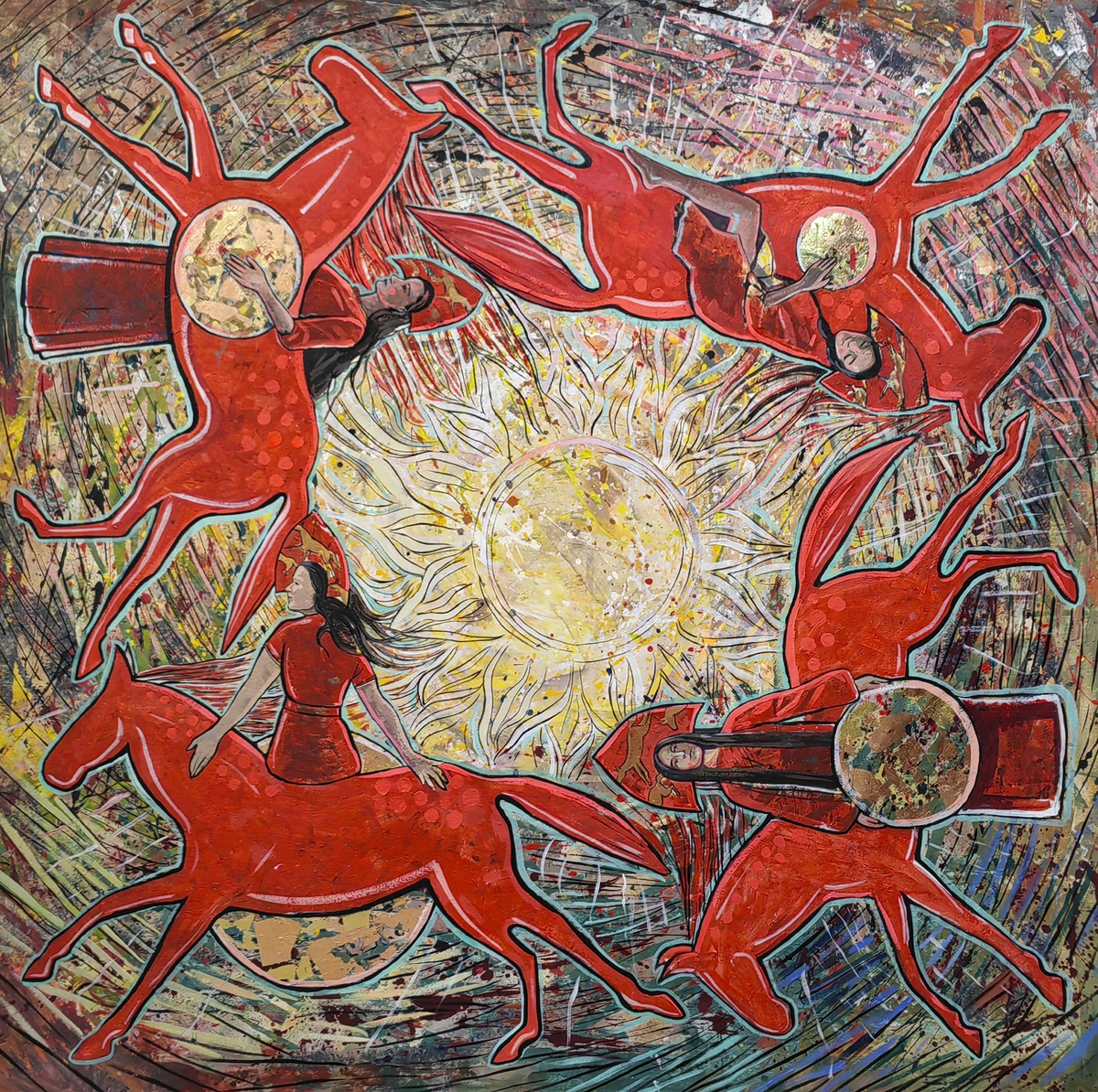 "Четыре красных солнца." Работа про основные праздники, связанные с солнцем. Самый короткий день-зимнее солнцестояние Коляда. Умирает старое солнце и рождается новое. Самый длинный день и самое большое солнце Купала. Весеннее равноденствие Масленица комоедица и осеннее равноденствие Хорос. Бегущие красные кони как бесконечный круговорот этих состояний Картину можно повесить любой из четырех сторон вверх или менять расположнние по сезонам, наполняя пространство мощью красного солнца