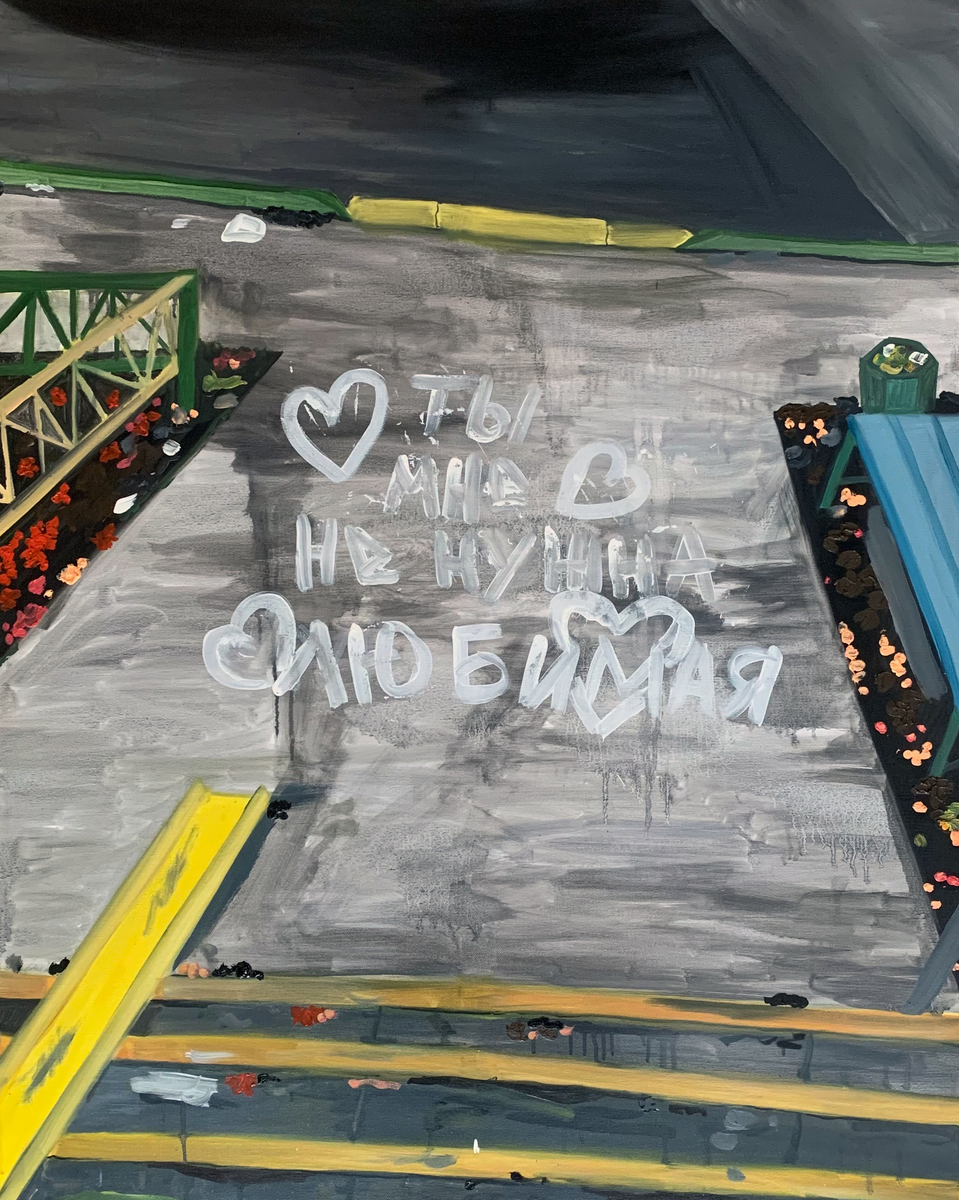 Работа была написана для первой персональной выставки "Ничего нового". Создана в ироничном ключе, по мотивам надписей у подъездов и под окнами, где кто-то кого-то просит вернуться или простить.