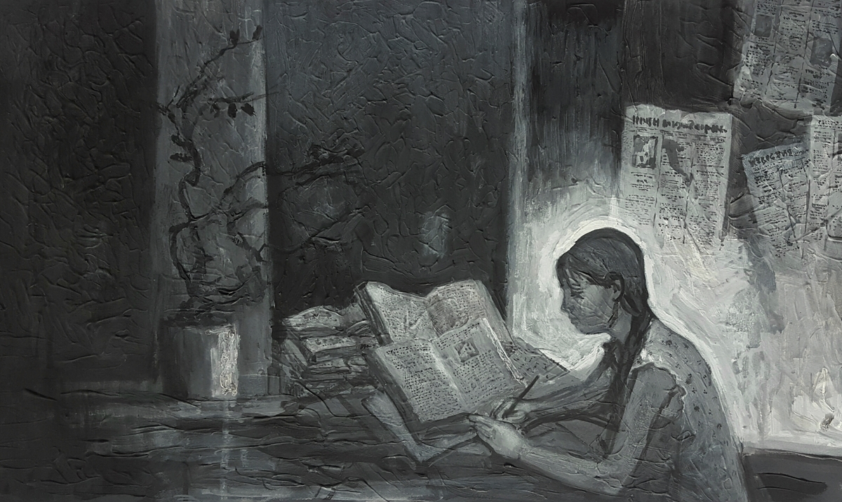 На картине изображена советская девушка, делающая домашнее задание. На дворе первая треть ХХ века, в комнате плохое освещение.