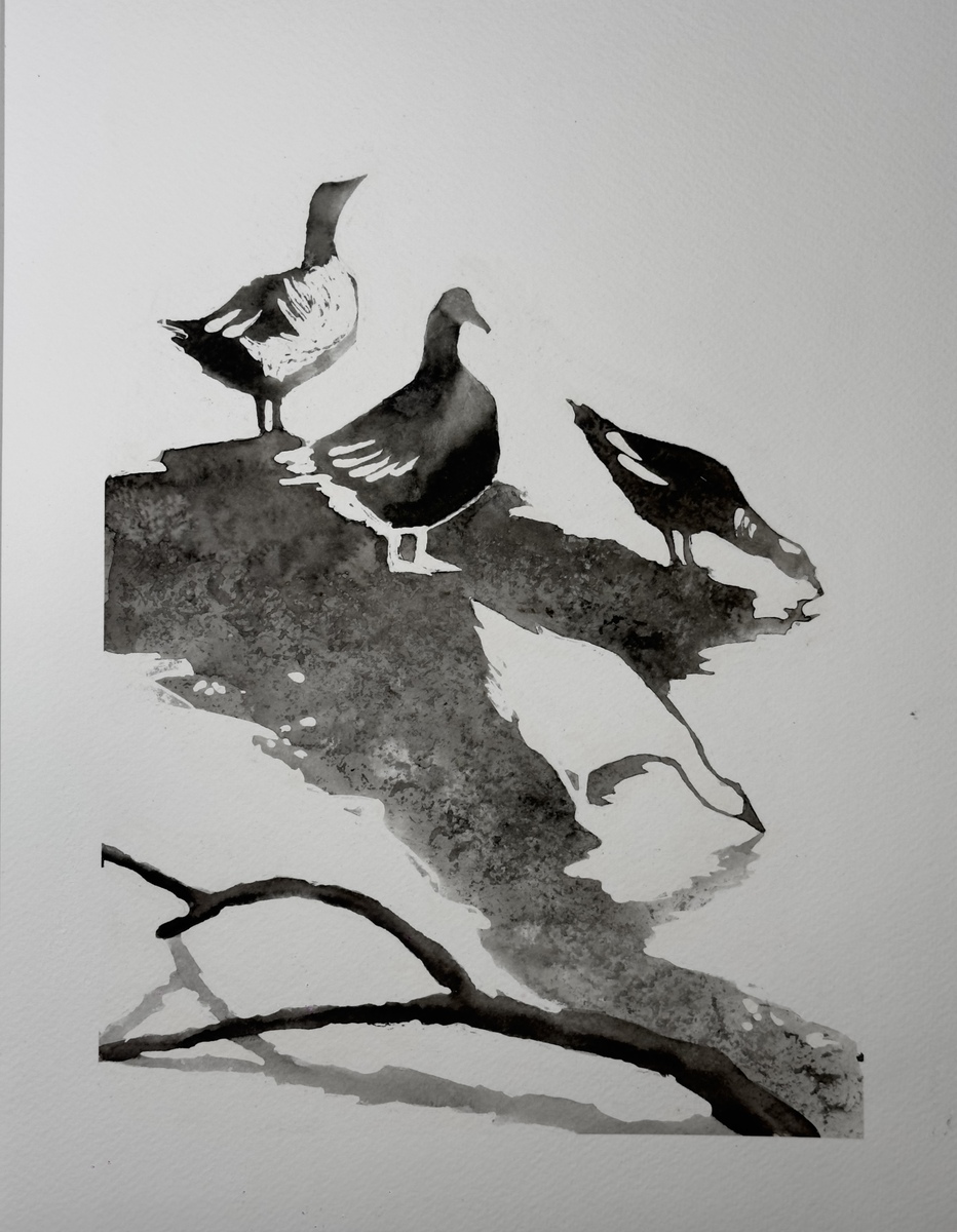 Акварель, бумага. Белые части изображения являются нетронутой фактурой бумаги. Простота и графичность композиции с гусями у пруда.