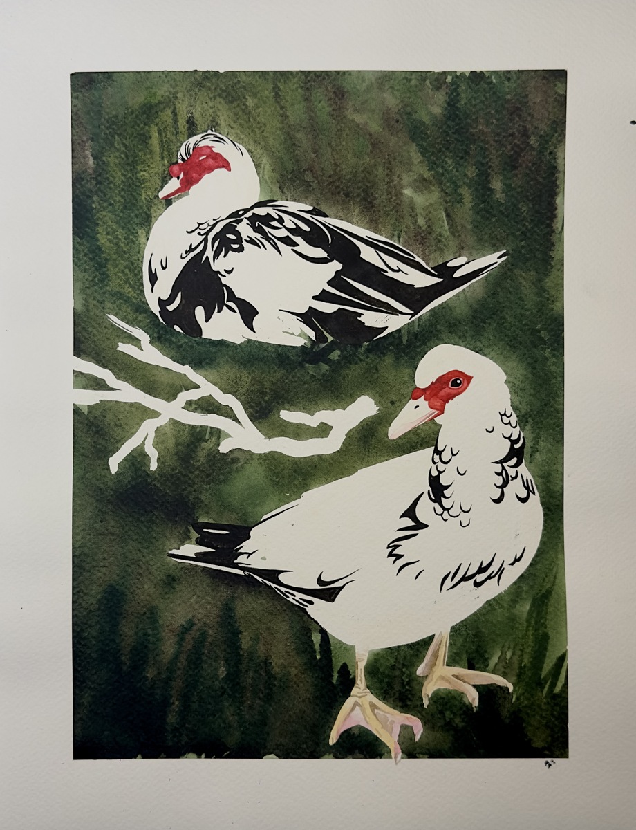 Акварель, черный акриловый маркер, бумага. Белые пятна изображения являются нетронутой фактурой бумаги, что добавляет графичности, условности. Сочетание живописности с условными черными и белыми пятнами.