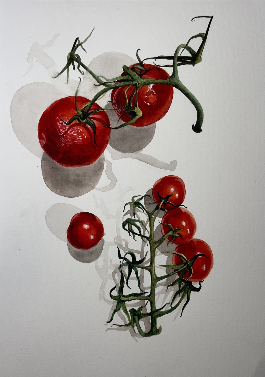 Акварель, бумага. Этюд веток томата, превратившийся в полноценную композицию.