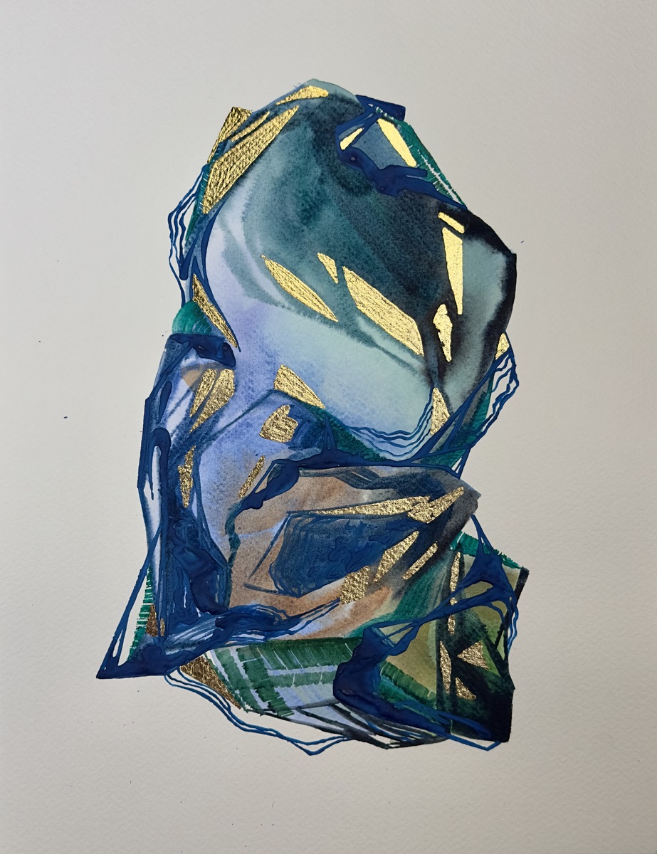Акварель, темпера, золотая поталь. Абстракция с изображением образа камня, найденного у ручья Сванетии. Сочетание прозрачности акварели и фактур плотной темперы, матовости и красок и сияния позолоты, пятен и линий.