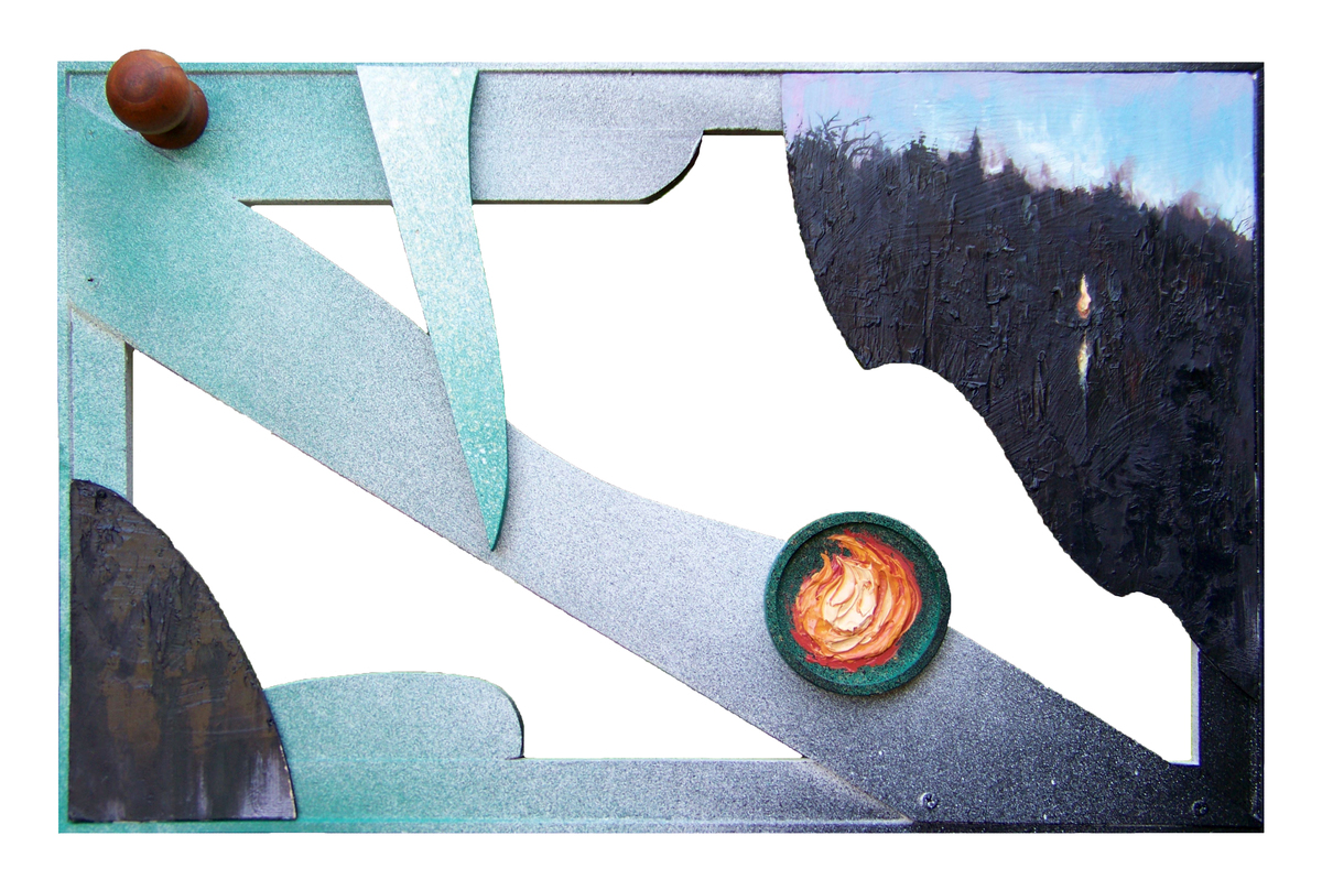 Абстрактная работа из серии Трансформация, в которой для создания ассамбляжей и коллажей используются фрагменты более ранних картин и этюдов. Серия метафорически сообщает о фрагментарности и деструктивности актуального контекста окружающей среды. Данная работа выполнена в смешанной технике и включает в себя использовавшийся ранее деревянный подрамник, этюд ночного костра и дверную ручку.