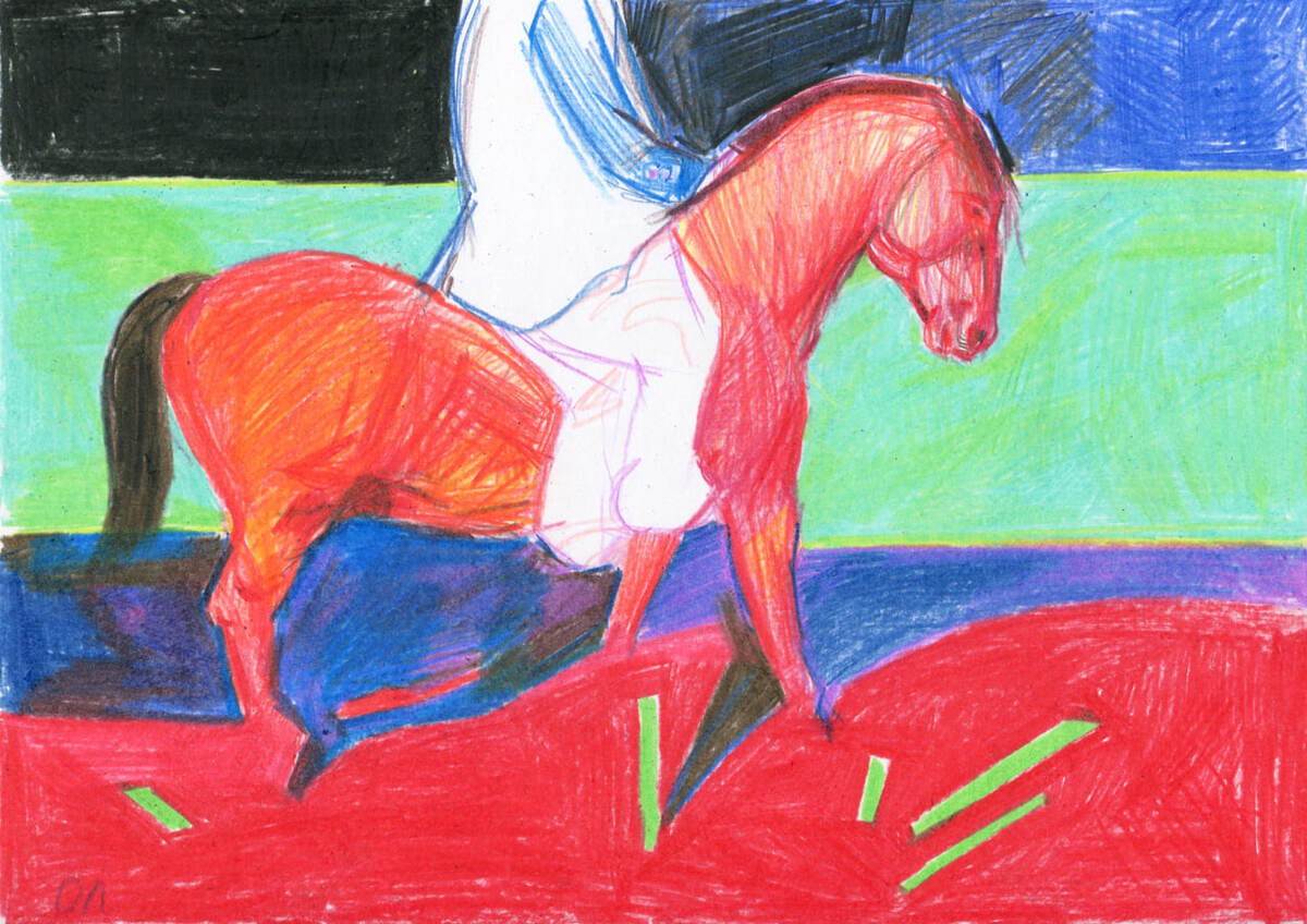 Эта работа — взгляд в будущее через образ всадника и красной лошади, символов судьбы и движения, которые на протяжении столетий повторяются в искусстве разных эпох. Здесь красная лошадь — не цитата, а реплика-микс на традицию художников, обращавшихся к образу всадника как к предвестнику перемен: от экспрессионистов с их огненными лошадьми до советской школы с её героическими силуэтами. Лошадь в работе — будто собранная из разных художественных кодов: яркий экспрессионистский цвет, графический штрих, фигуративная пластика, прерванная абстракцией. Это не иллюстрация прошлого, а его перезапуск. Цвета будто спорят: красный — импульс, движение, воля; зелёный — надежда; синее — ночное неизвестное, в которое входит наступающий год.