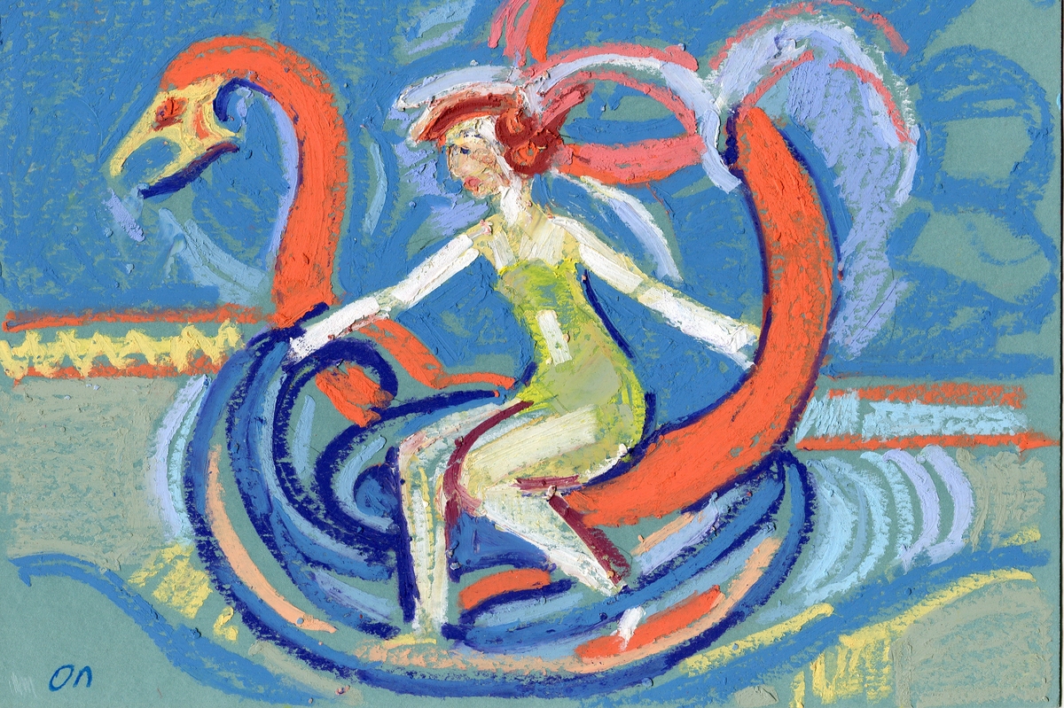 В работе оживает собственный миф о богине, управляющей водяной змеёй — древним символом потока, интуиции и скрытой силы. Женская фигура здесь выступает не объектом, а соавтором движения стихии: она ведёт и одновременно следует ритму существа, рождающегося из воды и цвета. Змея воплощает древний архетип первичных вод, хаоса и обновления, а сама богиня — способность направлять эту энергию, превращая беспокойный поток в творческую силу. Динамичные линии и вибрация цветовых слоёв создают ощущение ритуального танца, в котором рождается новая реальность. Работа исследует взаимодействие человека и мифа, момент, когда внутренний архетип становится живым спутником и союзником на пути самопознания.