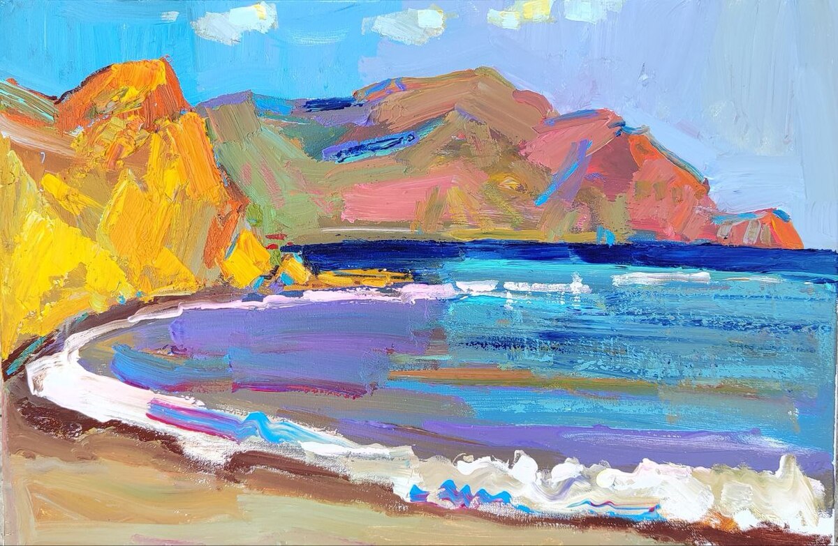 Работа написана у Тавриды Арт. Гора Меганом, песчаные обрывы, галичный пляж, морской бриз. С натуры на пленэре.