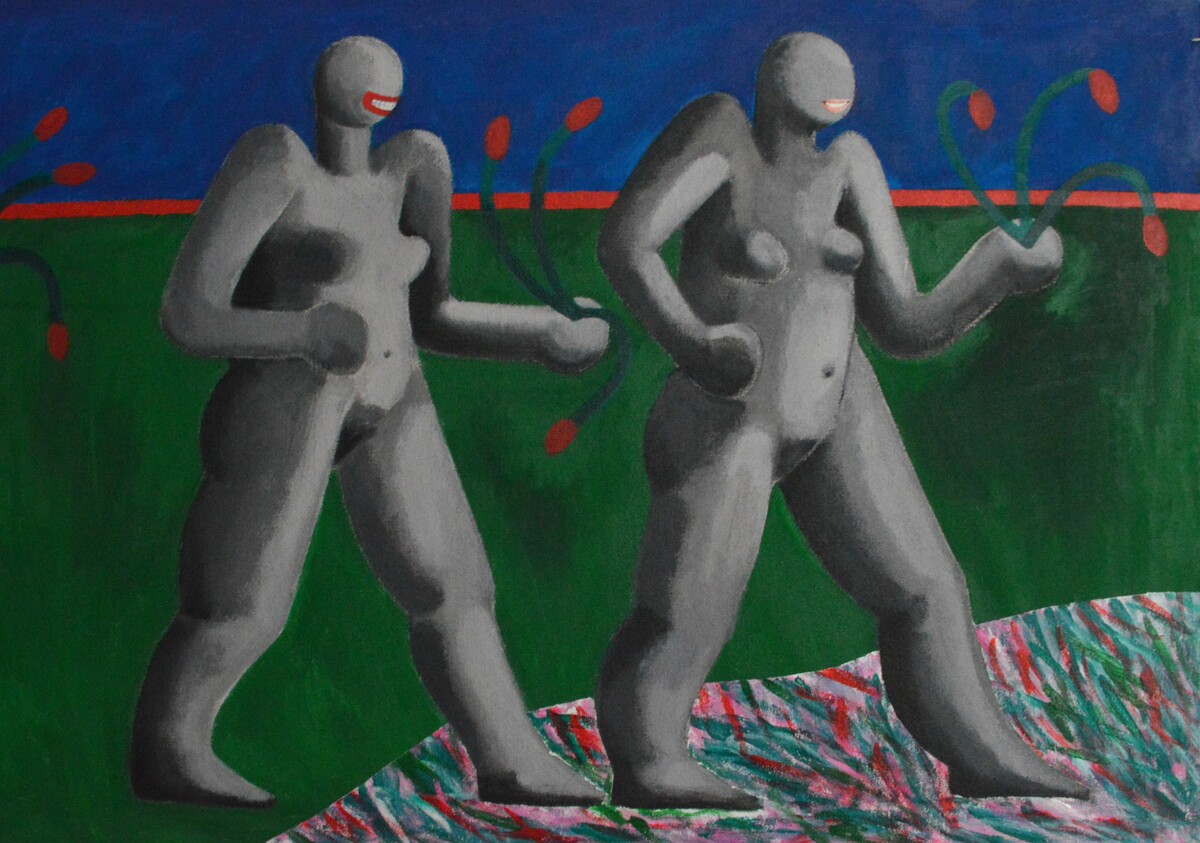 Период с 2022 -2024 перевожу конструкцию частично в пластику В этом периоде женщины двигаются с особым воинствующим напором , образ усиливается шарами -кулаками вместо рук. В современном мире женщина уже не зефирно-вздыхающее создание , а человек который делает выборы , которые могут сбивать с ног. Цветы в поле картины , единственное , что напоминает о невероятной нежности живущей внутри нее.