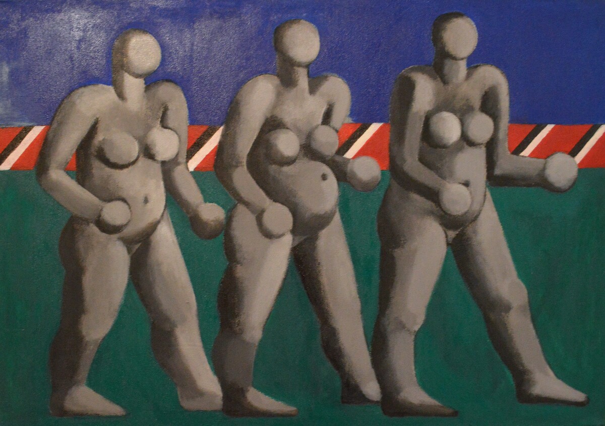 Период с 2022 -2024 перевожу конструкцию частично в пластику В этом периоде женщины двигаются с особым воинствующим напором , образ усиливается шарами -кулаками вместо рук. В современном мире женщина уже не зефирно-вздыхающее создание , а человек который делает выборы , которые могут сбивать с ног. Цветы в поле картины , единственное , что напоминает о невероятной нежности живущей внутри нее.