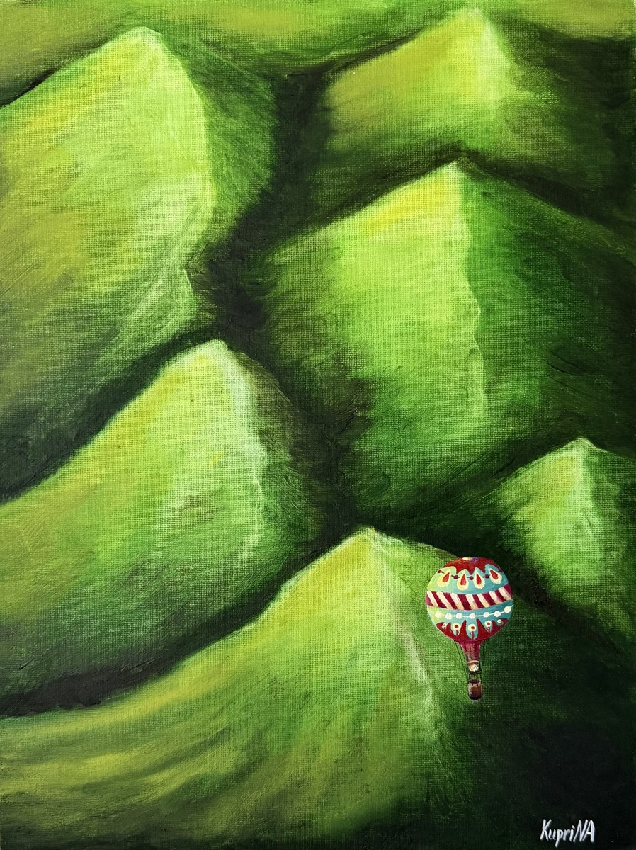Картина обращается к опыту взгляда сверху — к тому редкому состоянию, когда привычный мир внезапно меняет масштаб. Подобно моменту, когда из иллюминатора самолёта взгляд выхватывает из огромного пространства один фрагмент ландшафта, эти работы фиксируют короткое, почти медитативное мгновение сосредоточенности. Земная поверхность здесь превращается в абстрактную топографию — рельефы, складки и линии, которые одновременно напоминают природные формы и внутренние карты переживаний. Воздушный шар становится ключевым образом этой серии — символом легкости, свободы и движения вверх. Его присутствие в пространстве огромного ландшафта подчеркивает дистанцию между наблюдателем и землёй, создавая возможность увидеть происходящее иначе. С высоты природные текстуры теряют привычную конкретность и превращаются в пространство размышления: взгляд скользит по рельефу, отсеивая случайное и постепенно выделяя главное — одну мысль, одно чувство, одну мечту.