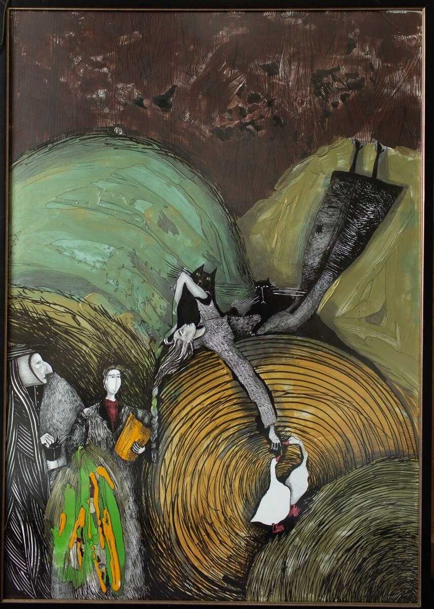 На сеновале Акрил, тушь 100× 70 cm