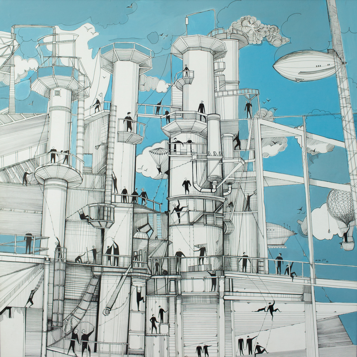 Заводы. Пароходы Акрил, тушь 70 × 70 cm