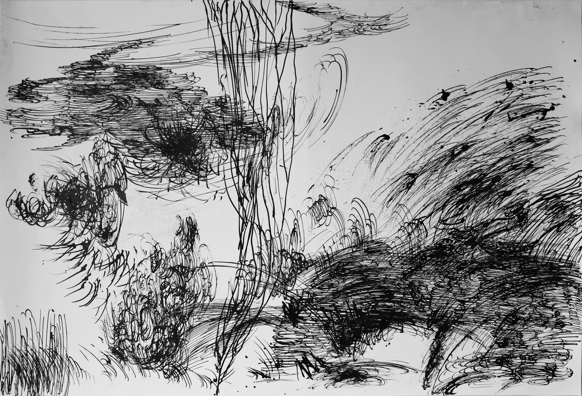 Из серии Абсолютное поле Крупноформатная графика, выполненная на бумаге тушью и пером. Графические листы являются размышлением на тему автоматического рисования, как средства выражения подсознания, освобождения акта рисования от рационального контроля. В результате стихийного экспрессивного рисования на бумаге можно различить круги и спирали - символы закономерности и цикличности, в которых явно прослеживаются намеки на пространство пейзажа. Пейзаж здесь вторичен, важным актом в этих графических листах является штрих, нарушающий гладкость поверхности листа, создающий движение, шум и ритм.
