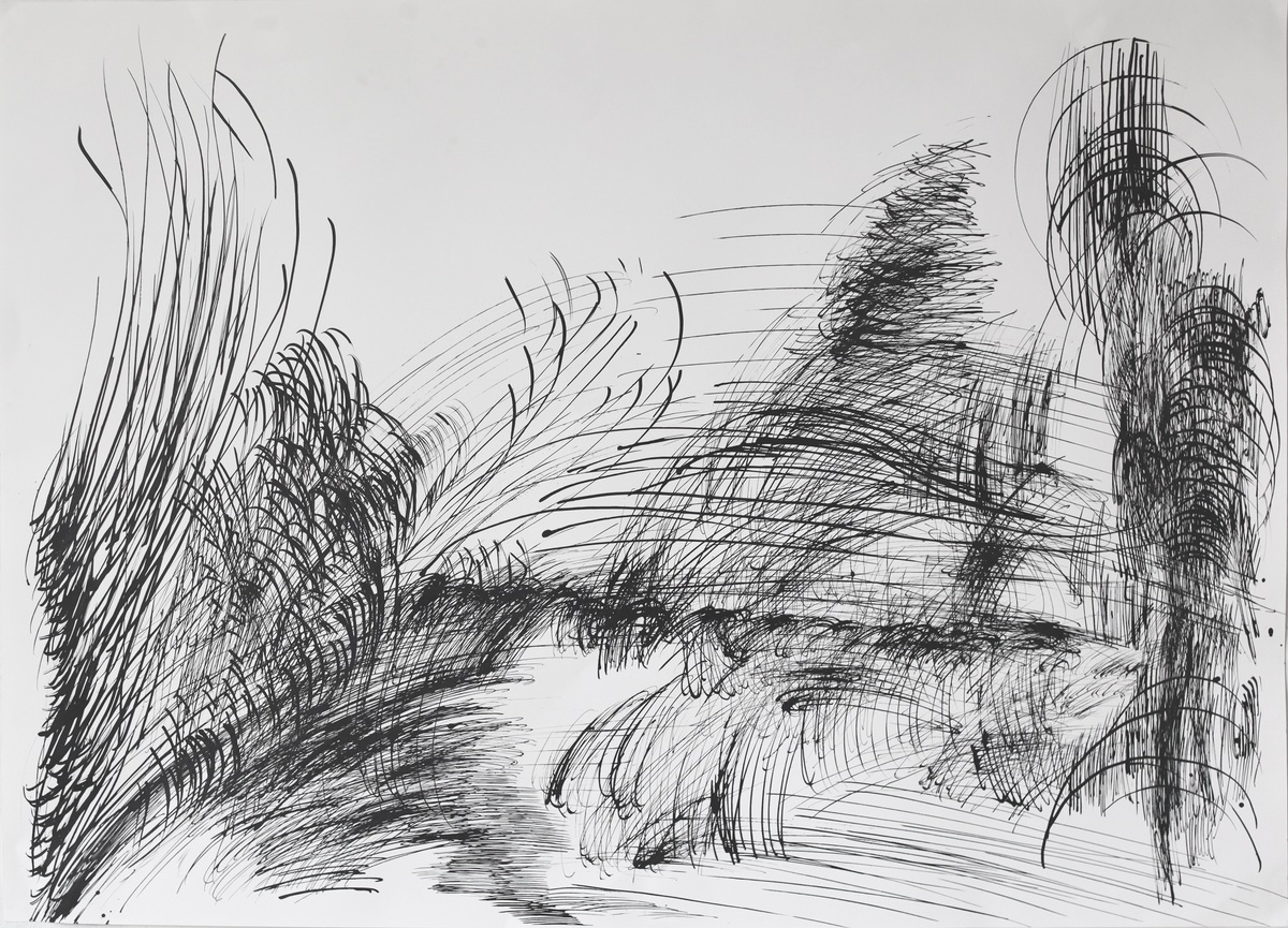 Из серии Абсолютное поле Крупноформатная графика, выполненная на бумаге тушью и пером. Графические листы являются размышлением на тему автоматического рисования, как средства выражения подсознания, освобождения акта рисования от рационального контроля. В результате стихийного экспрессивного рисования на бумаге можно различить круги и спирали - символы закономерности и цикличности, в которых явно прослеживаются намеки на пространство пейзажа. Пейзаж здесь вторичен, важным актом в этих графических листах является штрих, нарушающий гладкость поверхности листа, создающий движение, шум и ритм.
