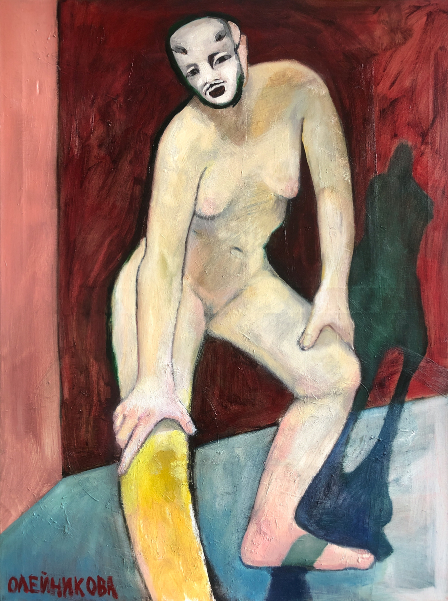 Эта картина, в отличие от основной части серии, сосредоточена на теле. Это создает еще большую дистанцию между изображением и зрителем.Серия про случайных собеседников из дейтинговых приложений и самых близких людей, которые умело скрывают свои истинные намерения и эмоции.Несмотря на частичную или полную наготу, здесь нет уязвимости и близости, а чувственность заменяется отстраненным любованием тела или условным, лишенным подробностей торсом «усредненного» человека.Я использовала такую компоновку фигур и раньше, например в сериях «Маленькие распятия друзей» и «Пляж». Раскинутые в стороны или поднятые вверх руки жестко «обрублены» форматом, так как нет надобности в цельности фигуры и любых подробностях. Поза здесь лишь условность. Отдельная подсерия - портреты-маски зайцев. Они более игривые и яркие. Я продолжаю работу с данной темой в настоящий момент.