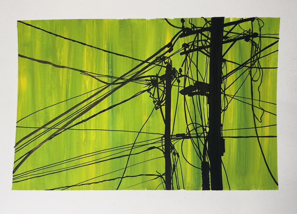 Темпера, черные акриловые маркеры, бумага. Стоит поднять голову, и заметишь совсем иное: сочетание силуэтов проводов и небо в разных его состояниях. Ритмы линий городов Грузии.
