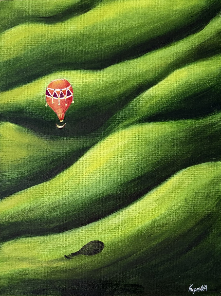 Картина обращается к опыту взгляда сверху — к тому редкому состоянию, когда привычный мир внезапно меняет масштаб. Подобно моменту, когда из иллюминатора самолёта взгляд выхватывает из огромного пространства один фрагмент ландшафта, эти работы фиксируют короткое, почти медитативное мгновение сосредоточенности. Земная поверхность здесь превращается в абстрактную топографию — рельефы, складки и линии, которые одновременно напоминают природные формы и внутренние карты переживаний. Воздушный шар становится ключевым образом этой серии — символом легкости, свободы и движения вверх. Его присутствие в пространстве огромного ландшафта подчеркивает дистанцию между наблюдателем и землёй, создавая возможность увидеть происходящее иначе. С высоты природные текстуры теряют привычную конкретность и превращаются в пространство размышления: взгляд скользит по рельефу, отсеивая случайное и постепенно выделяя главное — одну мысль, одно чувство, одну мечту.