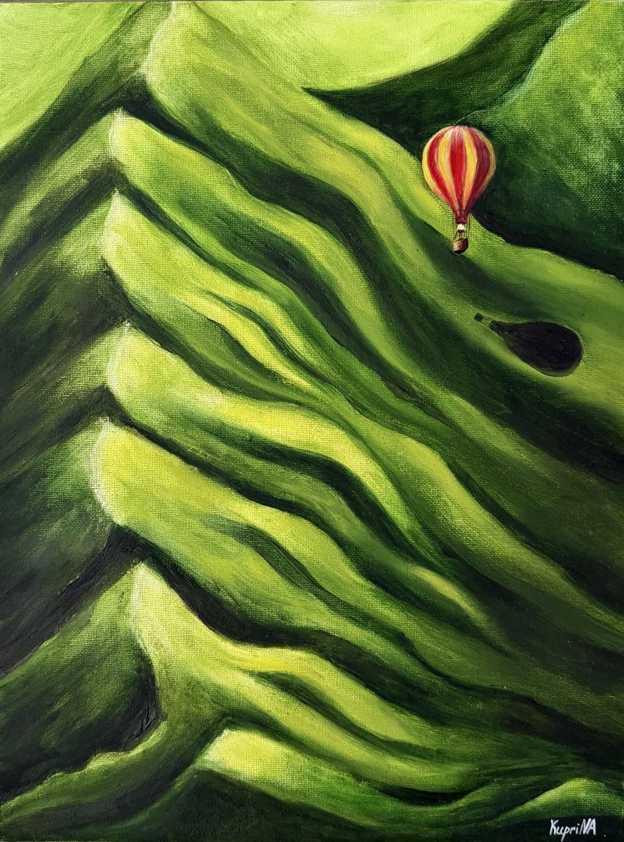 Картина обращается к опыту взгляда сверху — к тому редкому состоянию, когда привычный мир внезапно меняет масштаб. Подобно моменту, когда из иллюминатора самолёта взгляд выхватывает из огромного пространства один фрагмент ландшафта, эти работы фиксируют короткое, почти медитативное мгновение сосредоточенности. Земная поверхность здесь превращается в абстрактную топографию — рельефы, складки и линии, которые одновременно напоминают природные формы и внутренние карты переживаний. Воздушный шар становится ключевым образом этой серии — символом легкости, свободы и движения вверх. Его присутствие в пространстве огромного ландшафта подчеркивает дистанцию между наблюдателем и землёй, создавая возможность увидеть происходящее иначе. С высоты природные текстуры теряют привычную конкретность и превращаются в пространство размышления: взгляд скользит по рельефу, отсеивая случайное и постепенно выделяя главное — одну мысль, одно чувство, одну мечту.