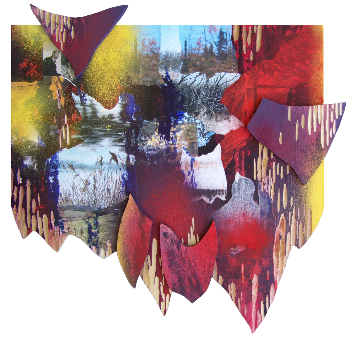 Абстрактная работа из серии Трансформация, в которой для создания ассамбляжей и коллажей используются фрагменты более ранних картин и этюдов. Серия метафорически сообщает о фрагментарности и деструктивности актуального контекста окружающей среды. Данная работа выполнена в смешанной коллажной технике с использованием акрила, спрей-краски, фрагментов фанеры и накатки фотографий работ прошлых лет.