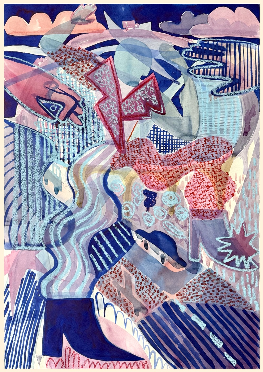 Работа вдохновлена ритмом жизни большого города и ритмом энергичного, чувственного танца. Картина выполнена на плотной, хлопковой акварельной бумаге акварелью, распадающимися и обыкновенными чернилами, масляной пастелью и штемпельной краской (которая использовалась для создания узора набранного из маленьких буквенных штампиков)