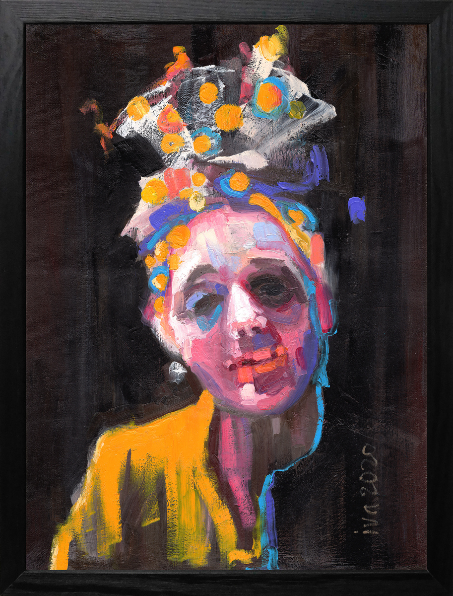 Масло, холст без подрамника, сатиновый лак, формат холста А2 (59,4х42 см). Картина оформлена в чёрную деревянную раму (62х44х1,8 см). В этой работе я использовала экспрессионизм с элементами фовизма, чтобы передать глубинную суть человеческих эмоций. Проницательный взгляд пожилой женщины и яркая палитра создают визуальный диалог между зрителем и автором, вызывая воспоминания из детства. Эта картина — о сложности человеческой души, сочетающей в себе нежность и участие в паре со внутренней силой и - иногда - эксцентричностью.