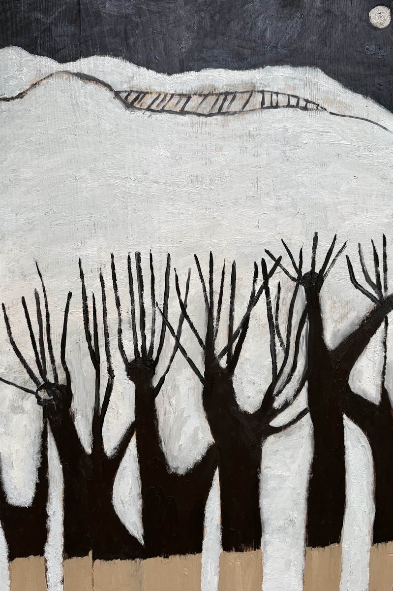 Яблоневый сад в начале января, укрытый снегом под полной луной