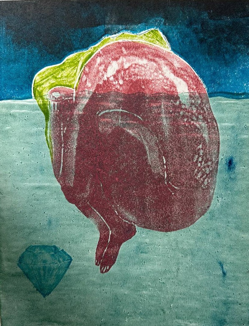 Работа выполнена в технике офортной печати - печать с пластика, монотипия.